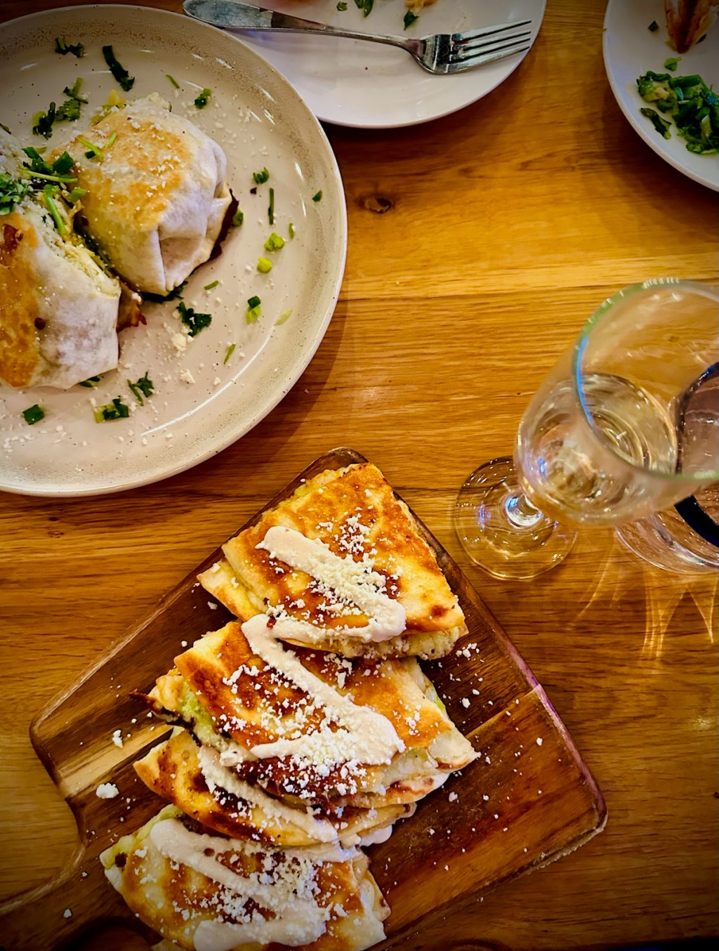 For entrees, everyone at the table got something different. Since basically every entree on the menu qualifies for the Savor deal: there are a lot of things to choose from! You can get a combo of two tacos, or one of several styles of quesadillas or burritos–and dude, let me tell you, their burritos are pretty hefty. Bestie is just enough of a masochist that they had to try the Hot Cheeto Burrito. While many Flaming Hot Cheeto inspired foods lean too far into hot-enough-to-hurt territory, this burrito was surprisingly well balanced. A blend of Wood Farms chuck, brisket, and short rib is enrobed in a flour tortilla with Hot Cheetos, rice verde, chihuahua cheese, pico de gallo, tinga sauce, and chipotle crema. The entire thing is covered in a blanket of queso and a snowfall of cautionary red Hot Cheeto dust. The queso absolutely does a lot of work in the way of providing unctuous fattiness to cut through the heat. Bestie was in burrito heaven. Since I’ve only ever gotten burritos on my previous trips to Solbird, I opted to go in a new direction. I ran directly into the arms of a quesadilla–which is for sure some quintessential, white girl bullshit. Sorry not sorry: the Shrimp, Pesto, and Goat Cheese quesadilla might be the least spicy, traditional, or Mexican/Korean fusion inspired dish on the menu…but, it slaps. The quesadilla is cut into four adorable triangles and served on a wooden plank. Adorbs. The gorgeously browned tortilla is filled with ancho shrimp, a pesto-goat cheese blend, and chihuahua cheese. The individual triangles are topped with a squiggle of chipotle crema; so if you’re not in favor of getting food on your fingers, maybe this isn’t the dish for you. Your girl loves shrimpys, your girl loves goat cheese, and anybody who doesn’t enjoy a bit of pesto is no friend of mine. Despite all of my known passions, was this menu item a weird pick for me? Totally. When I go somewhere, I try to get cuisine that really highlights what that place is all about. I could have done the Thai Shrimp Burrito (again; because I’ve had it before and loved it) or I could have ventured into Korean Beef Taco territory. But I didn’t–and you know what–I have zero regrets. I know the Shrimp, Pesto, Goat Cheese quesadilla is probably on the menu to assuage picky-eaters–but y’all should give it a go. It’s really delightful. The subtle herbaceous pesto notes, the creamy goat cheese mixed with the melty pull of the Chihuahua cheese, and the really nice firm bite of the shrimp: this quesadilla is a winner.